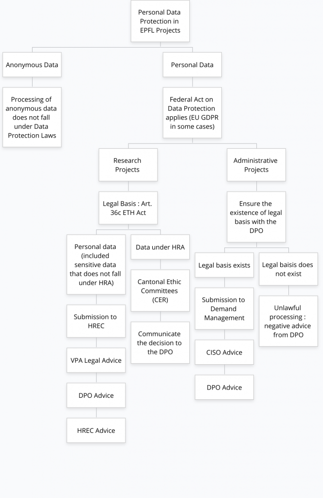 IMPORTANT : Le schéma ci-dessous présente, du point de vue de la protection des données, la manière dont les chercheuses et les chercheurs ou les gestionnaires de projets administratifs doivent traiter les projets impliquant des données personnelles. Bien entendu, d’autres aspects doivent être pris en compte: le financement du projet, le respect d’autres exigences scientifiques, éthiques ou juridiques.