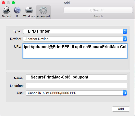 • URL : lpd://pdupont@PrintEPFL1.epfl.ch/SecurePrintMac-Col