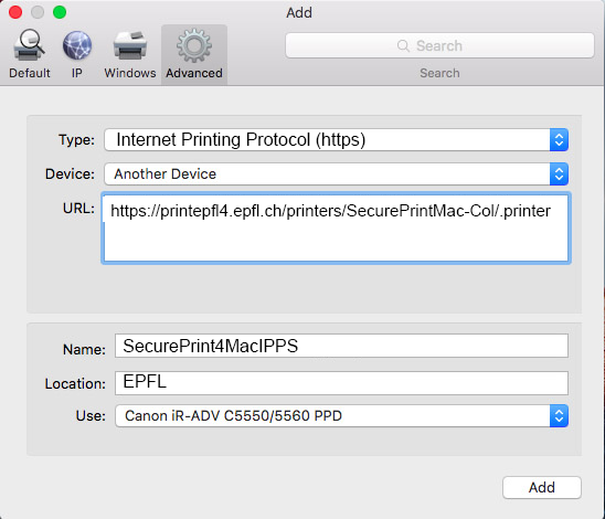 • URL : https://PrintEPFL4.epfl.ch/printers/SecurePrintMac-Col/.printer