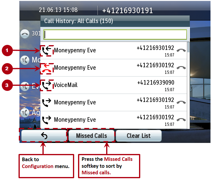 Press the Clear List softkey to delete the whole Missed Calls list.