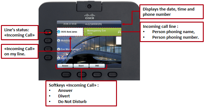 If Do Not Disturb is active, when you have an incoming call, only one beep rings on your phone, the line button flashes red, the phone’s screen displays the name and/or the phone number of the caller and you are able to answer the phone.